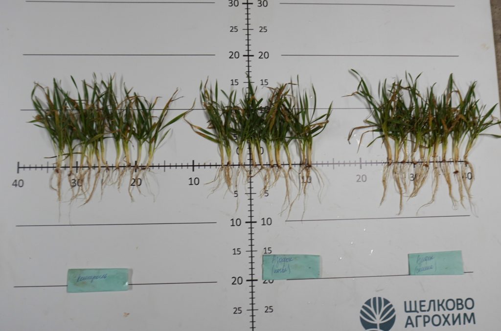 Визуально различий между вариантами опыта не наблюдалось. Но специалисты Краснодарского представительства «Щёлково Агрохим» отобрали образцы растений для проведения дальнейшего осмотра. Были получены интересные результаты: на вариантах с применением АЗАФОК показатели длины и самих растений, и корневой системы были больше, чем на контроле. Максимальный коэффициент кущения зафиксирован на варианте с предпосевной обработкой семян – 3,3. Для сравнения: на контроле он составил 2,8.