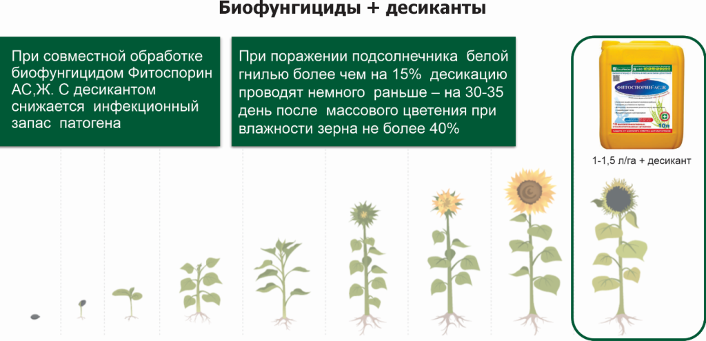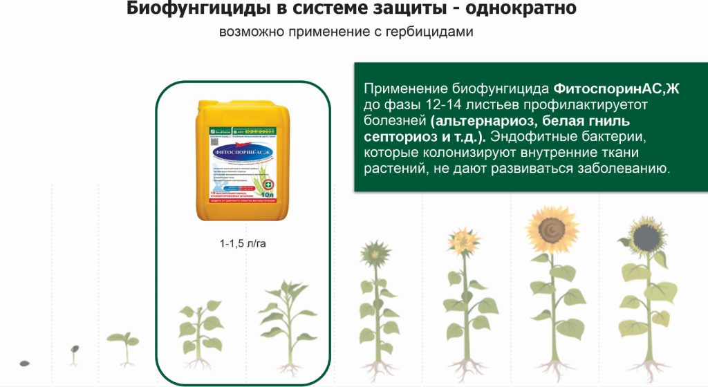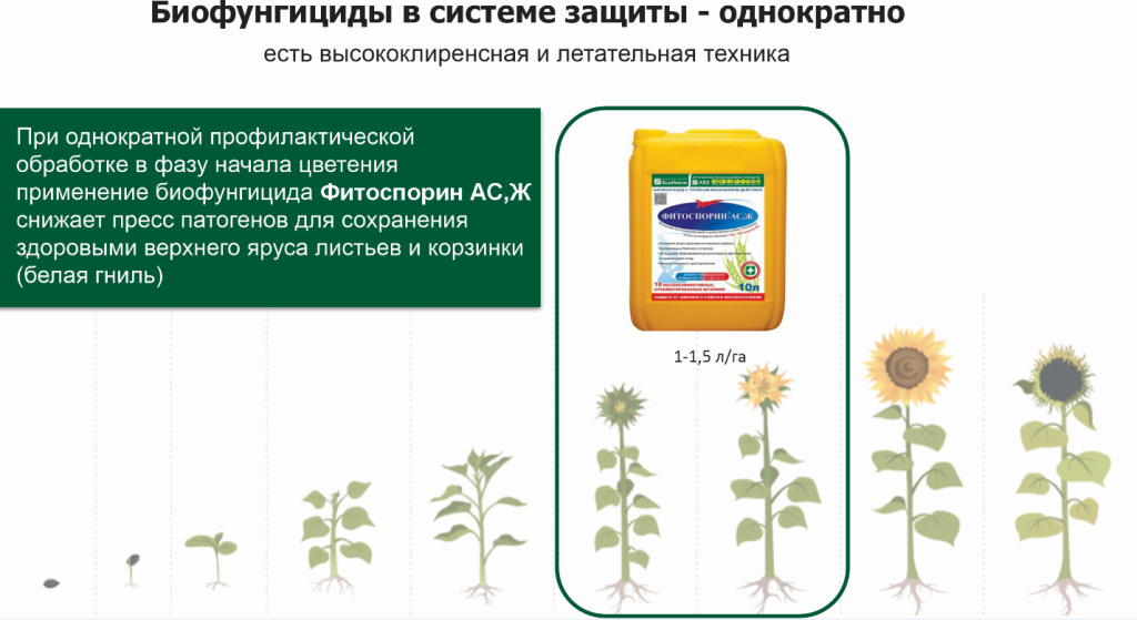 Эффективным методом биоконтроля склеротиниозной гнили являются микроорганизмы определённых видов и штаммов (грибы и бактерии). ООО НВП «БашИнком» рекомендует в системе защиты подсолнечника апробированный трёхкомпонентный биофунгицид Фитоспорин-АС, Ж.