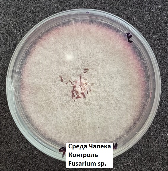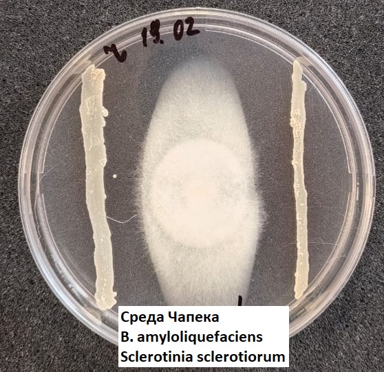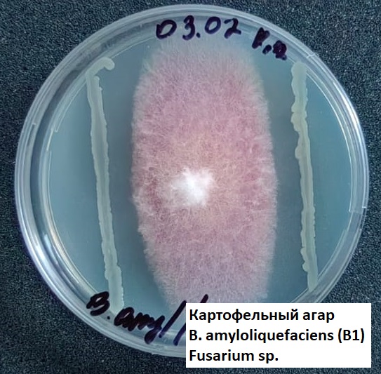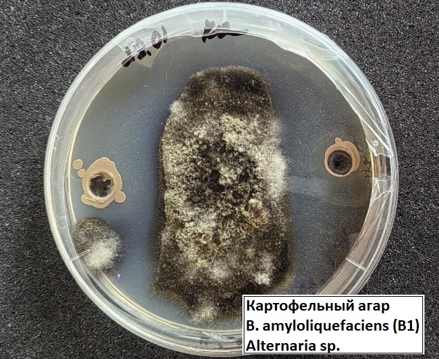 В условиях лаборатории научно-производственного предприятия «Сибирские Гуматы» проведена проверка фунгицидной активности бактерий Bacillus amyloliquefaciens и Bacillus subtilis против грибов рода Fusarium, Alternaria, Aspergillus, Sclerotinia.