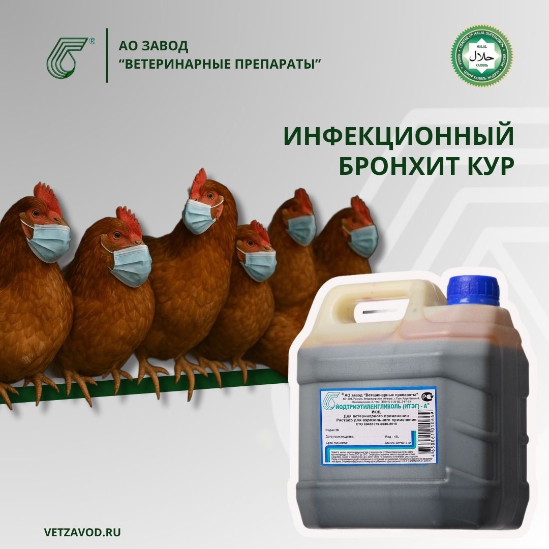 Для профилактики и лечения респираторных заболеваний, включая инфекционный бронхит кур, специалисты завод «Ветеринарные препараты» разработали антисептический препарат на основе йода для аэрозольного применения – ЙТЭГ-А.