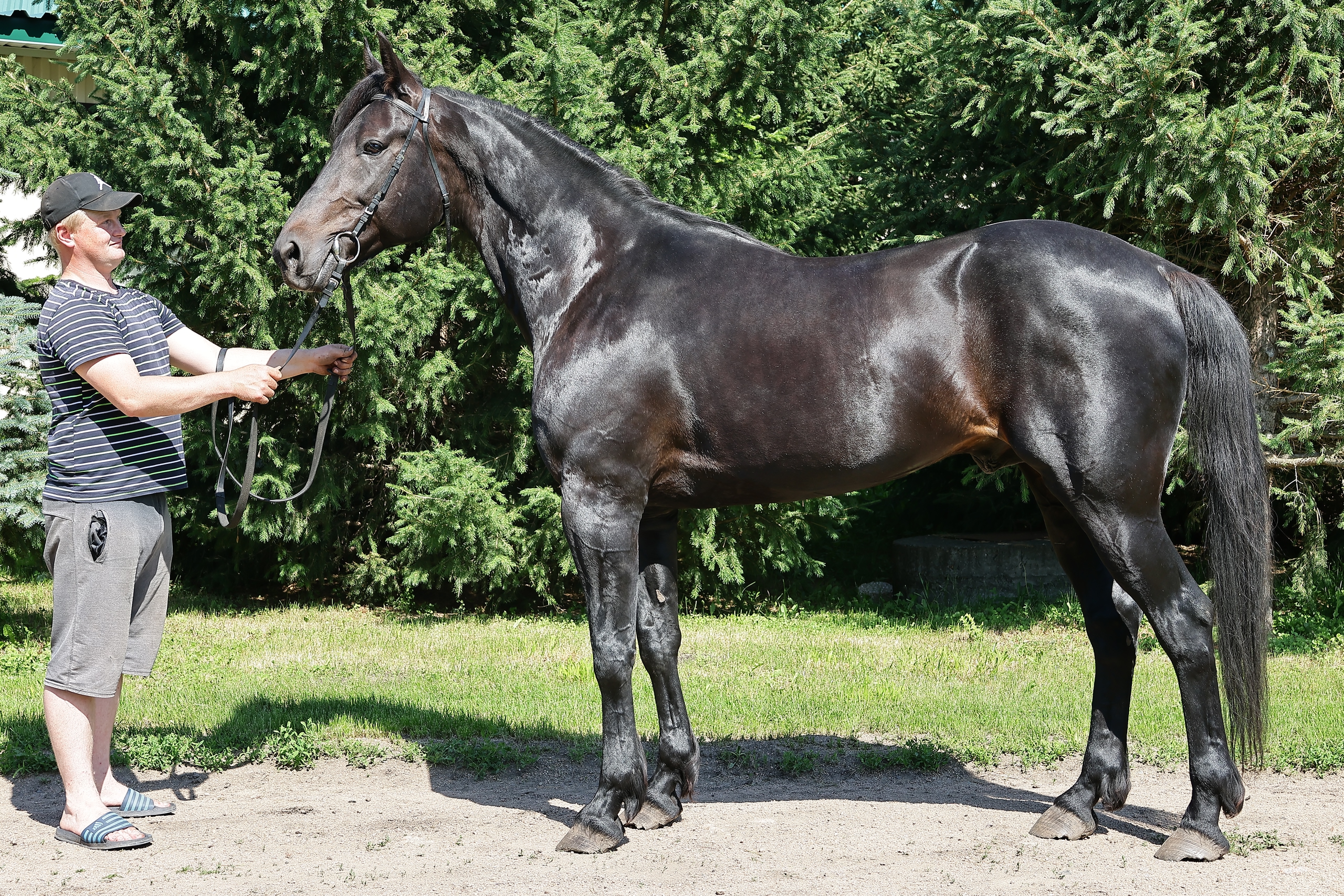 – Все они должны быть видны, смотреться естественно и непринужденно. При этом центр тяжести не переносится на какую-то из сторон, – поясняет Денис Лубнин. – Переднее копыто, которое ближнее к фотографу, должно чуть-чуть загораживать кончик второго дальнего, задние ноги – стоять пошире. Между ними обязательно должны быть просветы, чтобы было хорошо видно суставы. Корпус не должен быть растянут или сжат, поэтому в момент съемки нельзя тянуть лошадь за повод. Голова чуть повернута к объективу, потому что, если на лошадином лбу есть отметины, они должны быть видны. Уши должны стоять, а хвост – висеть.