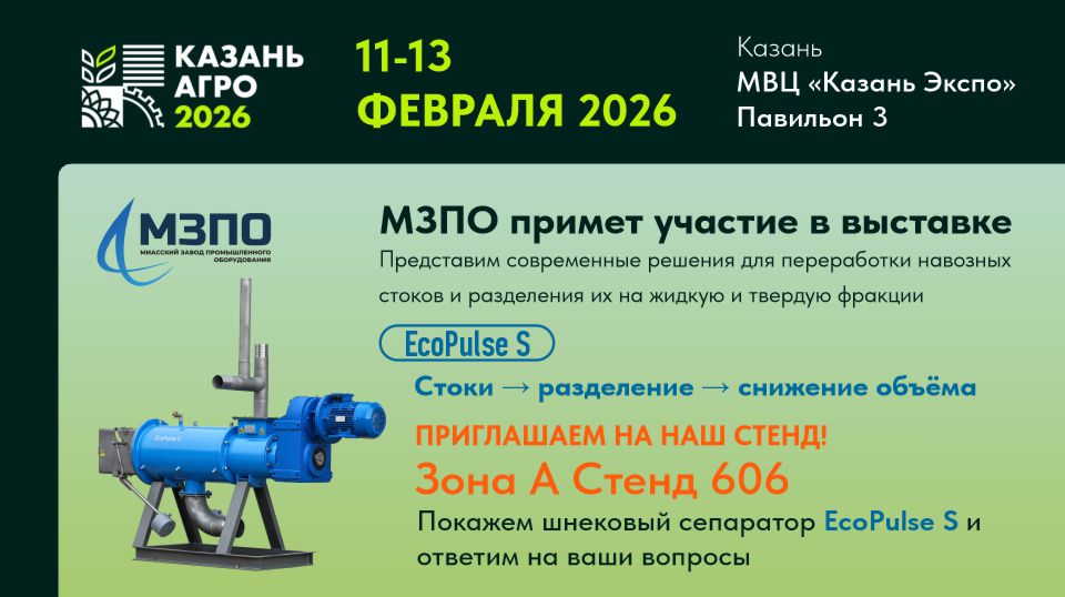 Главным экспонатом стенда МЗПО станет шнековый сепаратор EcoPulse S — практичное решение для переработки навоза, позволяющее снизить затраты и повысить эффективность хозяйства. Посетители стенда смогут лично ознакомиться с оборудованием и обсудить его применение под свои задачи.