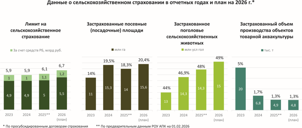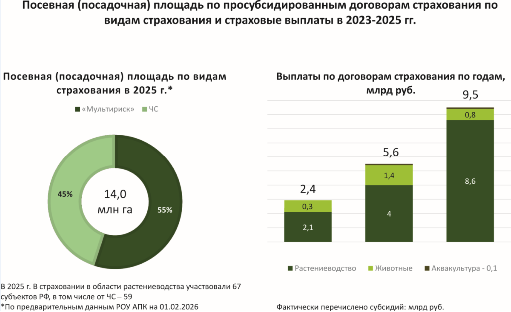 При этом Александр Двойных отметил, что динамика страхования посевных площадей в минувшем году замедлилась. Если, по предварительным данным РОК АПК на 1 февраля 2026 года, в 2024 году было застраховано 15,3 млн га, что составило 19,5% общего объема посевных площадей, то в минувшем году 14,0 млн га или 18,3%.