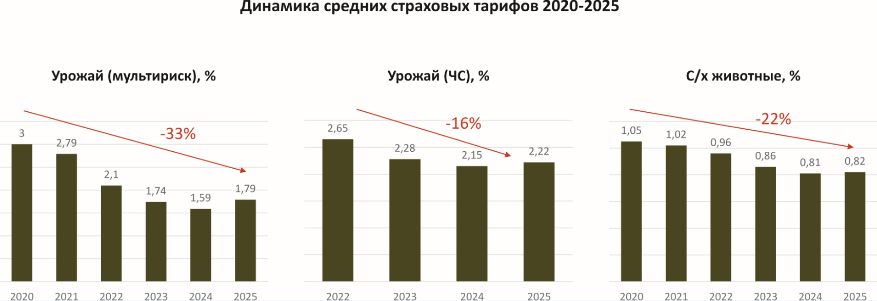 Еще один немаловажный итог этой работы: снижение страховых тарифов с 2020 по 2025 годы. Так, страхование урожая по программе «Мультирск» за этот период снизилось на 40%, страхование ЧС (с 2022 года) – на 16%, страхование животных на 22%.