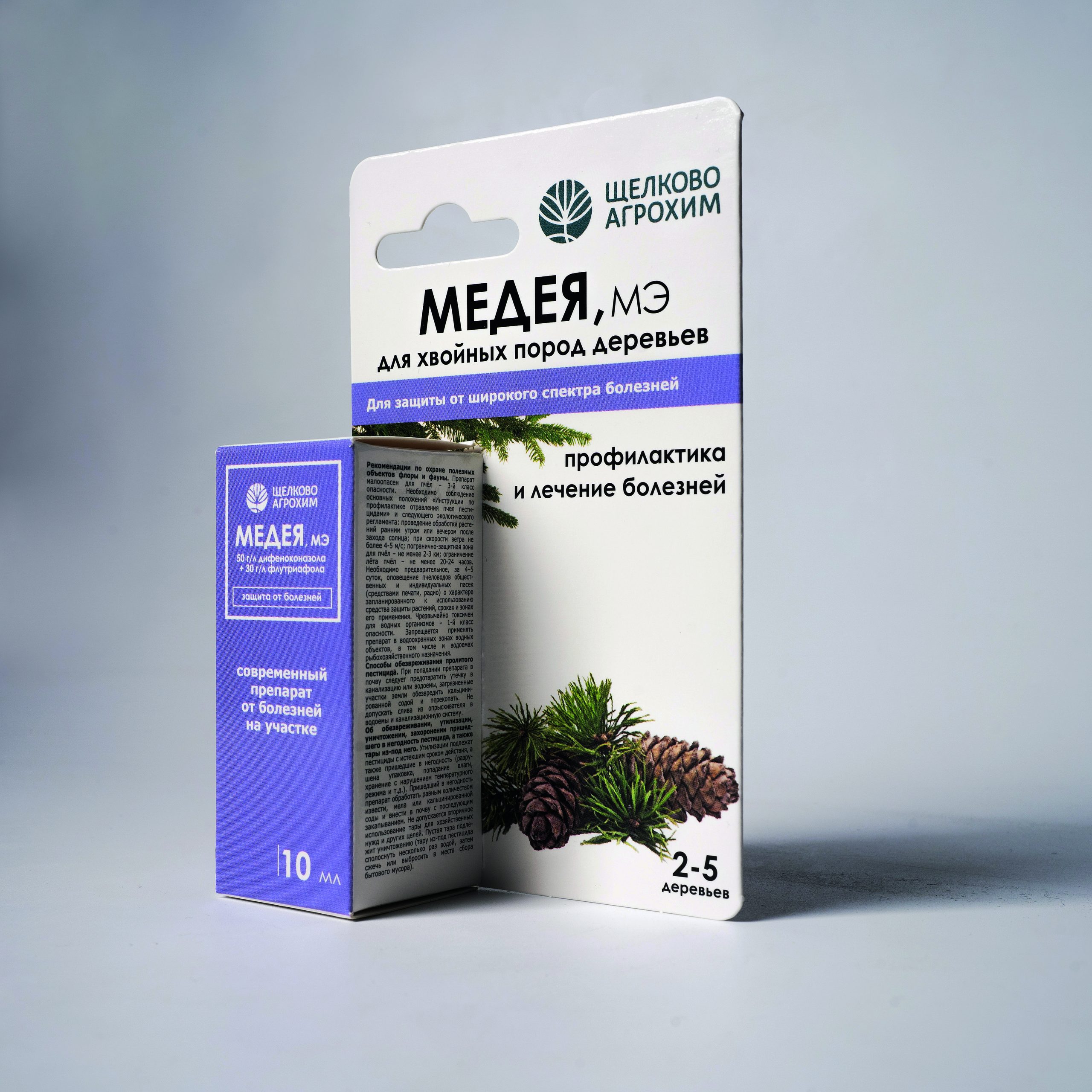 МЕДЕЯ, МЭ – это комбинированный системный фунгицид в форме микроэмульсии. Такая форма позволяет препарату мгновенно проникать в ткани растения и останавливать болезнь на любой стадии. Препарат высокоэффективен против обыкновенного шютте – распространённого грибного заболевания, которое поражает хвойные деревья.