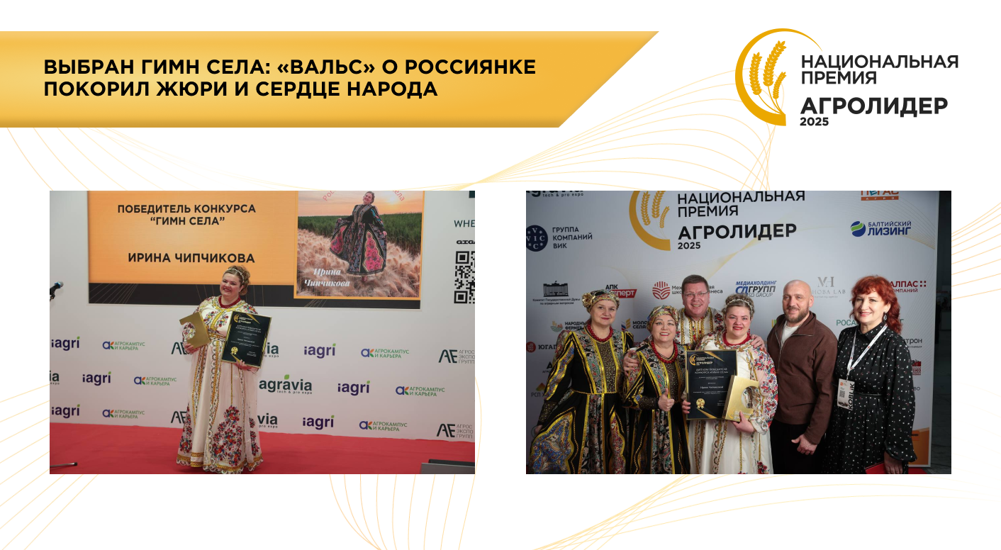 В рамках церемонии награждения лауреатов национальной премии «АГРОЛИДЕР» финалисты конкурса исполнили проникновенные песни о любви к деревне, земле, традициям, патриотизму и гордости за Родину. Это мероприятие стало настоящим праздником возрождения музыкальных традиций и самобытной культуры русского села!